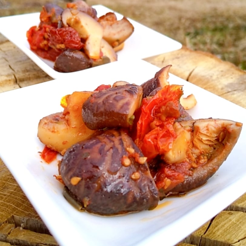 原木椎茸、ミニトマト、オリーブオイル、グレープシードオイル、塩漬けケッパー、オレガノ、レモン、にんにく、赤唐辛子