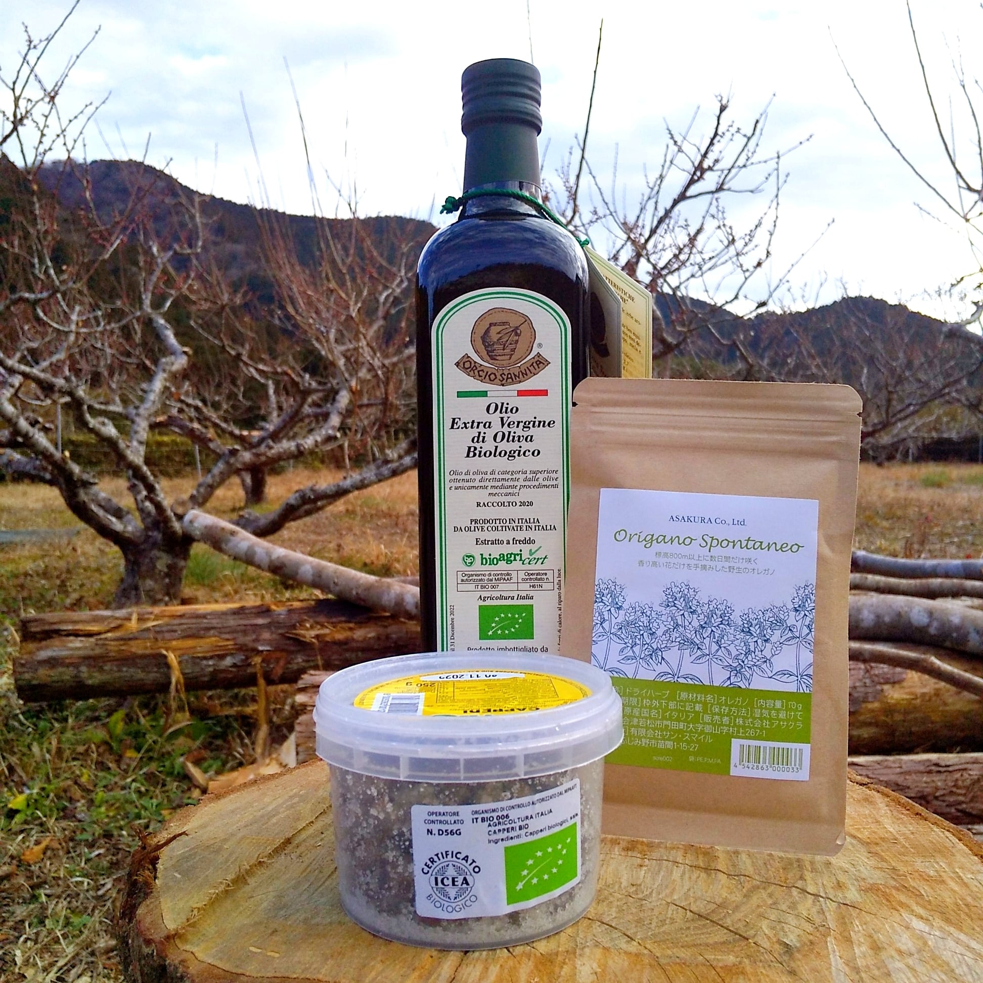 ③仕上げのオリーブオイル・オルチョサンニータと塩漬けケッパー、オレガノは自然栽培を大切にしているイタリア産のアサクラアイテム